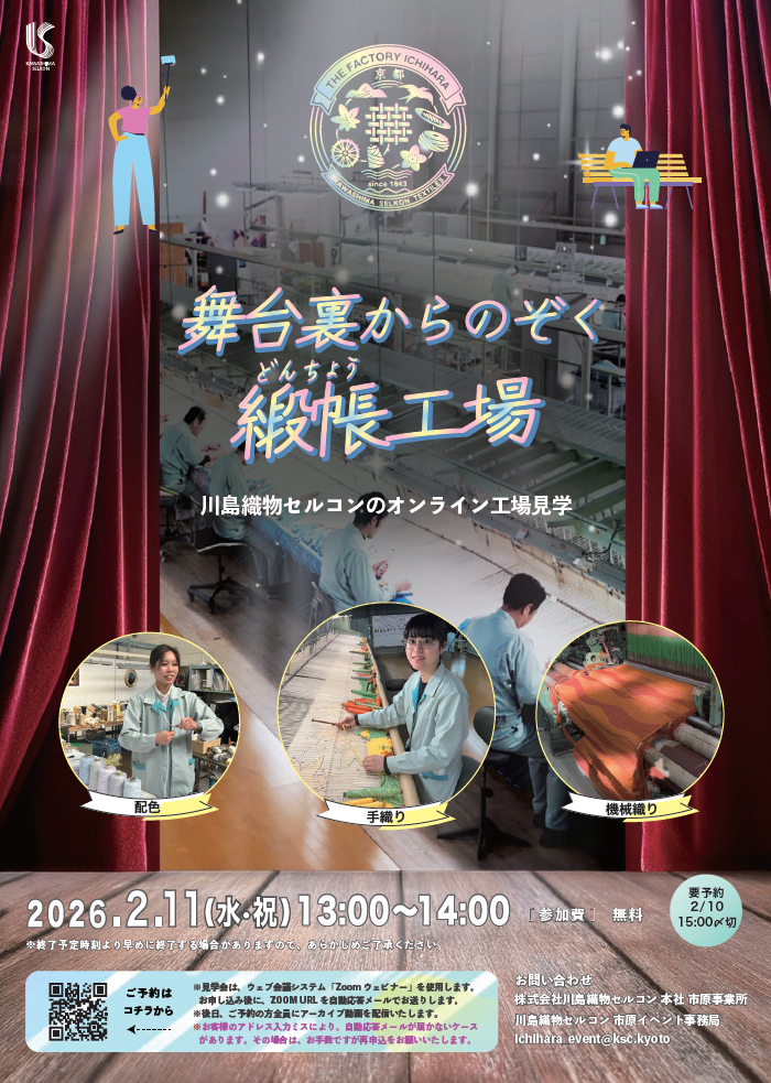 ㈱川島織物セルコンは2月11日(水・祝)にオンライン工場見学「舞台裏からのぞく緞帳工場」を開催する。見学会では、手織りから機械織りまでのリアルな製作工程を紹介する。職人技の光る織りや配色の技術について、技術者による実演やインタビューを交えながら伝える。なお、参加は事前予約制となっている。