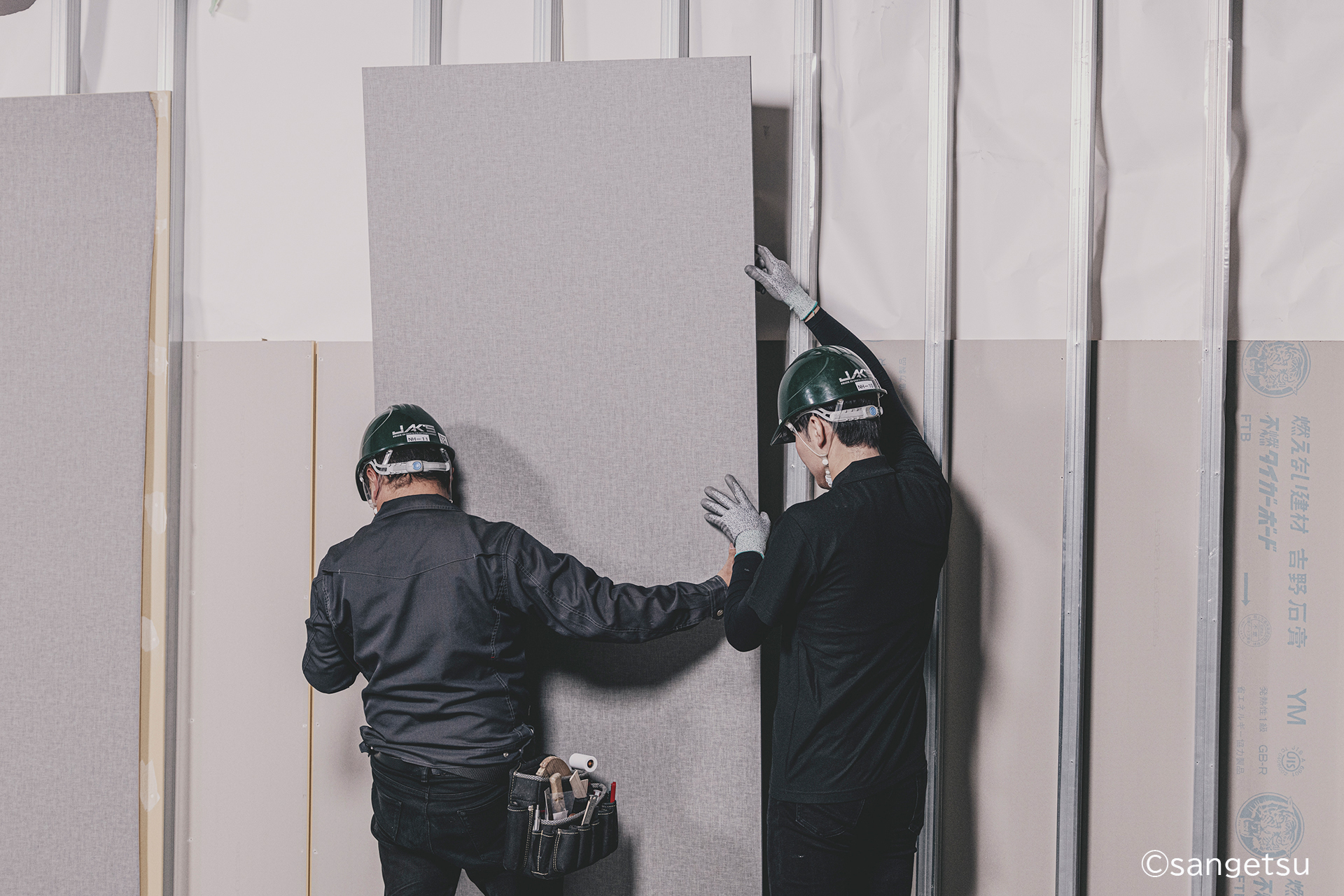 同商品は、サンゲツ、吉野石膏㈱、フジプレアム㈱3社の技術が結集して生まれたもので、従来現場で行っていた施工工程を商品で補完することで、「省施工」を通じた現場作業の軽減、ひいては建設業界の生産性・持続性の向上を目指す。