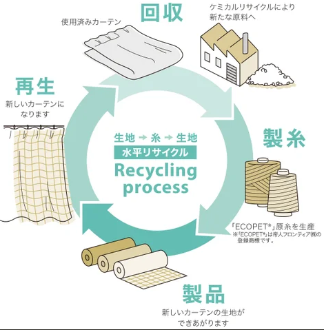 ㈱サンゲツと、帝人フロンティア㈱は、環境負荷低減に向けた戦略の一環として、不要となったポリエステル製のカーテンを新しいカーテンとして再生する「水平循環リサイクルシステム」の運用を開始する。